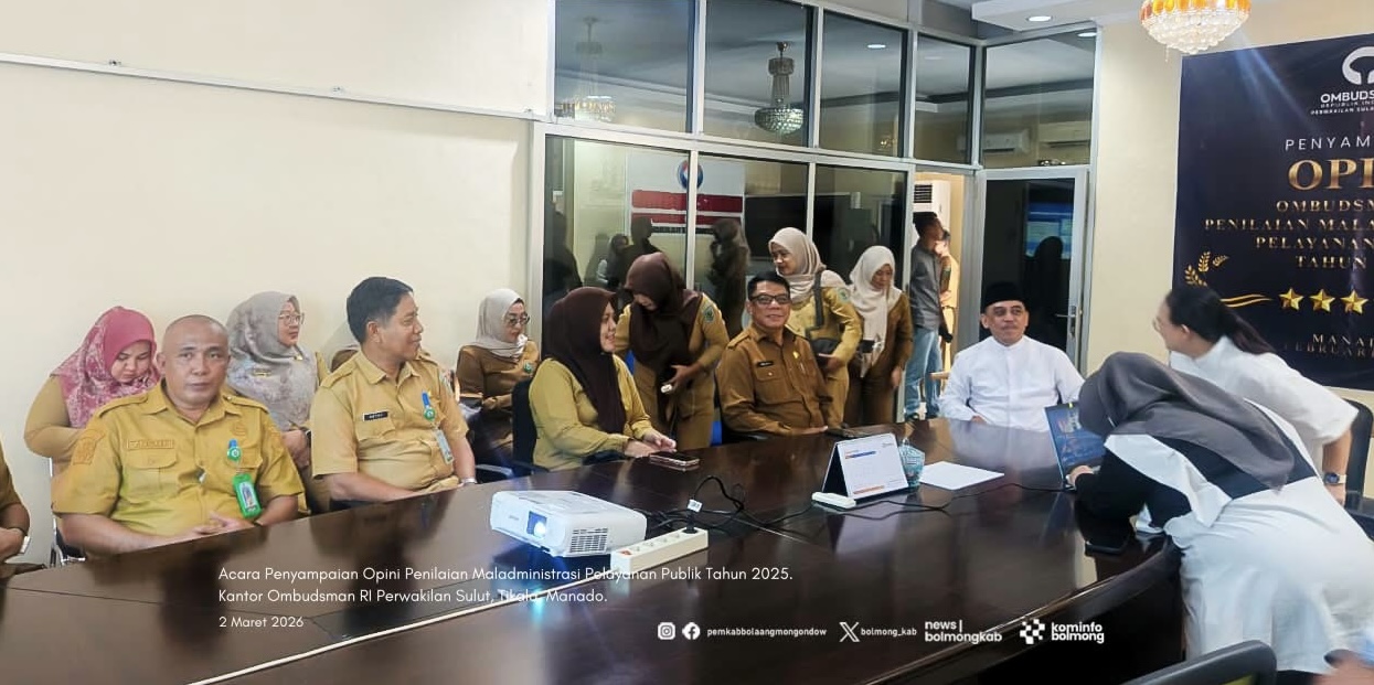 BOLMONG – Pemerintah Kabupaten Bolaang Mongondow (Bolmong) meraih opini kategori tinggi dalam penilaian pelayanan publik dan maladministrasi tahun 2025 dari Ombudsman Republik Indonesia. Bolmong mencatat nilai akhir 85,18, tertinggi, berdasarkan hasil evaluasi yang diserahkan di Kantor Ombudsman RI Perwakilan Sulawesi Utara di Manado.Senin (2/03/2026).